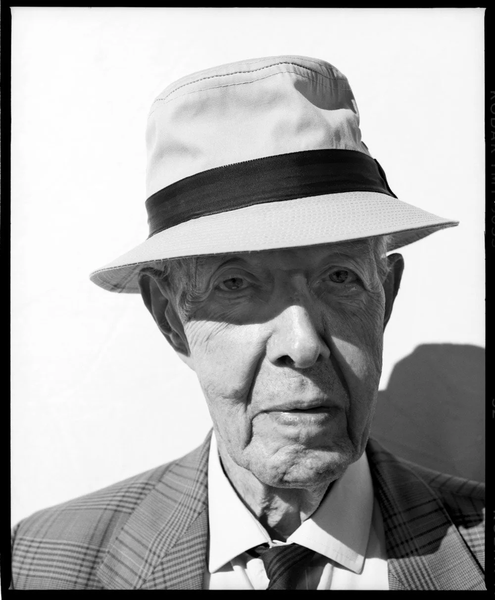 Black and white photo of an elderly man wearing a checkered suit, white shirt, tie, and a hat with a wide brim and a dark band. The man has a serious expression.